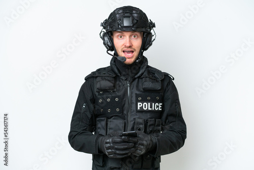 SWAT man over isolated white background surprised and sending a message