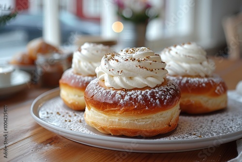 Sweden: Semla A round cardamom bun filled with almond paste and whipped cream, dusted with powdered sugar