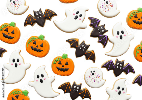 Sweet & Spooky Halloween Cookie Pattern: Adorable Ghost, Bat, and Jack-o'-Lantern Sugar Cookies on White Background