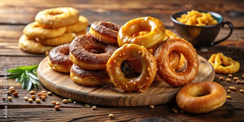 Sweet and savory ring-shaped delights – doughnuts, onion rings, pretzels – perfectly photographed.