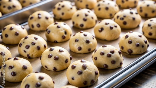 Sweet balls of vanilla shortbread dough studded with dark chocolate chips await baking, providing a delicious treat for those with a sweet tooth.