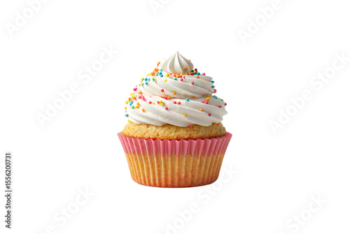 Sweet birthday cupcake topped with creamy frosting and rainbow sprinkles in cheerful yellow wrapper, isolated on a transparent background