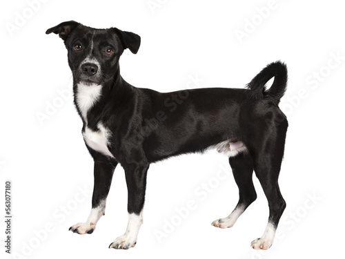 Sweet black and white shorthaired stray dog, standing side ways. Looking towards camera with brown eyes. Isolated cutout on transparent background.