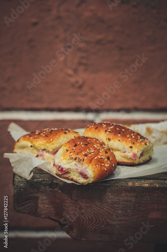 sweet buns with jam on a wooden background