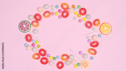 sweet candies and jelly beans make copy space frame on pastel pink background. Flat lay