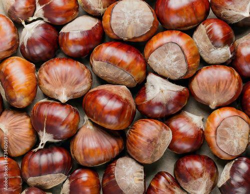 Sweet Chestnuts Top view. Copy space. Pile of ripe chestnuts for food background closeup.