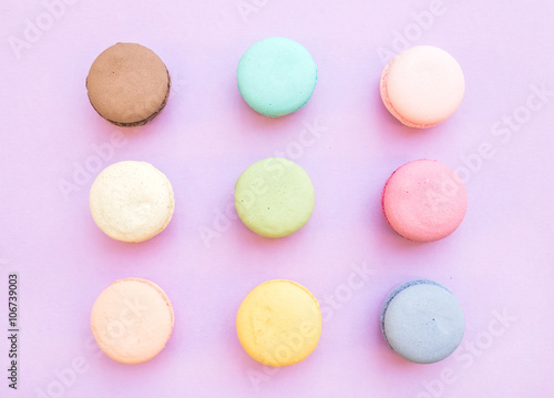Sweet colorful French macaroon biscuits on pastel lilac background