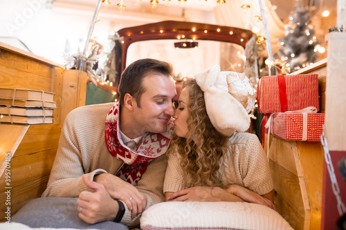 Sweet couple kissing and enjoying their time together in pickup car. Christmas lights on background
