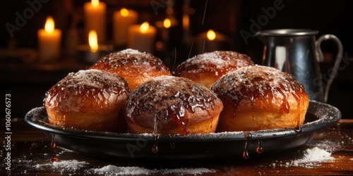 Sweet Doughnuts Drizzled with Caramel Sauce and Sprinkled with Powdered Sugar in a Rustic Setting