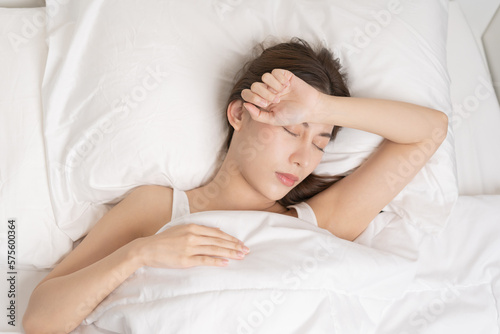 Sweet dreams, attractive smile pretty asian young woman, girl sleeping in comfortable bed lying on soft pillow resting, keeping eyes closed while with covered blanket in cozy white bed in the morning.