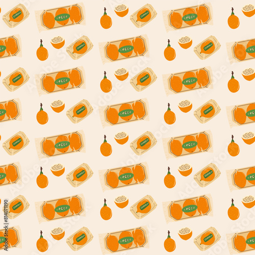 Sweet granadilla fruit packaging seamless pattern. Tropical fruits endless background. Yellow passion fruit product repeat cover. Exotic food loop ornament tile. Vector hand drawn flat illustration.