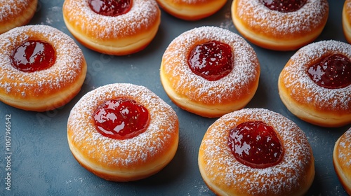 Sweet Hanukkah doughnuts topped with powdered sugar and jam on a light blue background, ideal for festive food promotions.