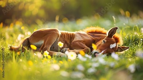 Sweet little sleeping chestnut foal baby horse outside on a lawn in spring flowers meadow
