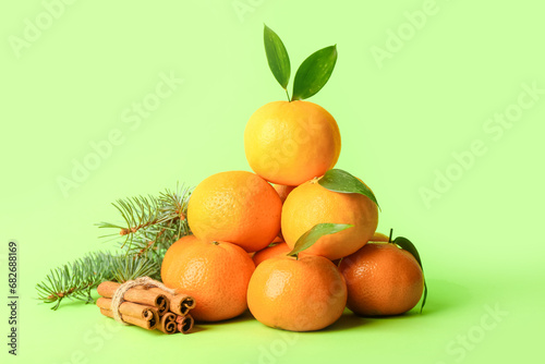 Sweet mandarins with cinnamon and Christmas tree branches on green background