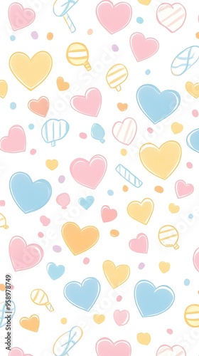 Sweet Pastel Hearts and Candies Pattern in Kawaii Style on White Background - Simple and Cute Design for Sweet Treats Concept