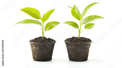 sweet pepper and pepper seedlings in the ground, photo without pots with root system, close-up on a white background, side view