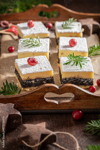 Sweet Poppy seed cheesecake for Christmas with icing sugar.