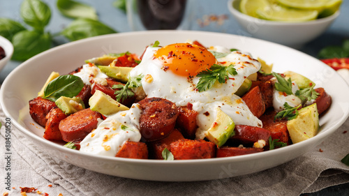 Sweet Potato and Chorizo Hash with egg, avocado and herbs.