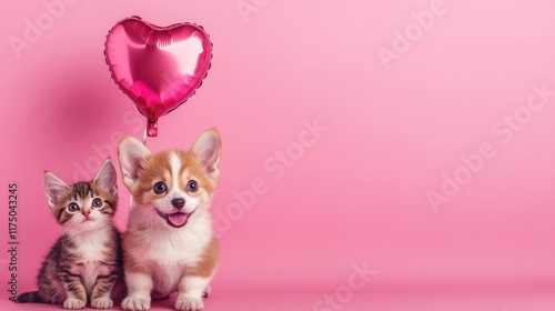 Sweet puppy and kitten pair posing with a Valentines heart balloon on a cheerful pink background.