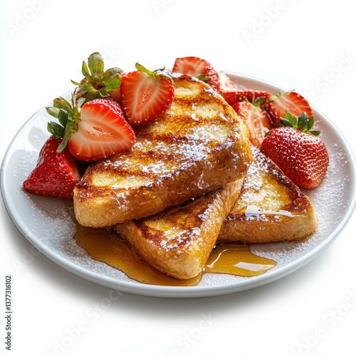 Sweet Start: A delightful plate of golden-brown french toast is adorned with vibrant strawberries, creating a visual and culinary treat. A touch of sweetness is added with a drizzle of maple syrup.