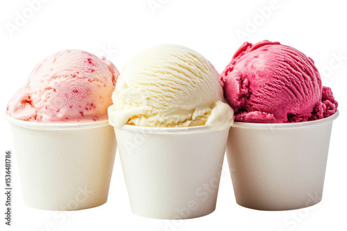 Sweet summer indulgence Triple scoop delight of strawberry vanilla and raspberry ice cream on black isolated on transparent background. Generative Ai.