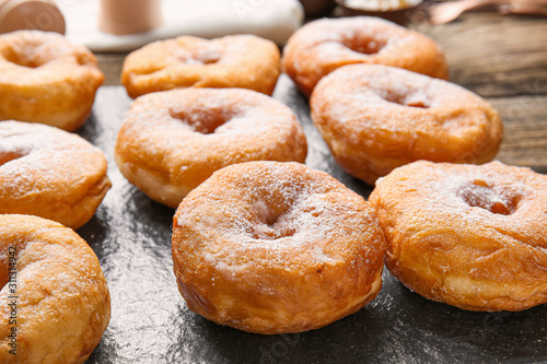 Sweet tasty donuts on table