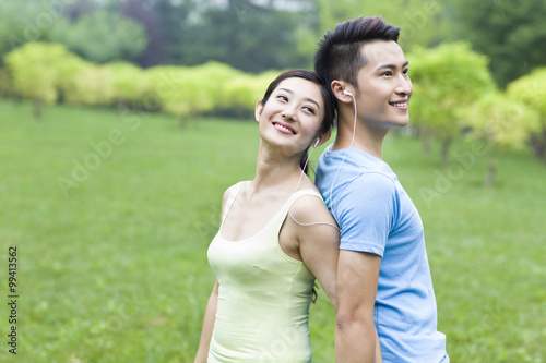 Sweet young couple listening to music in park