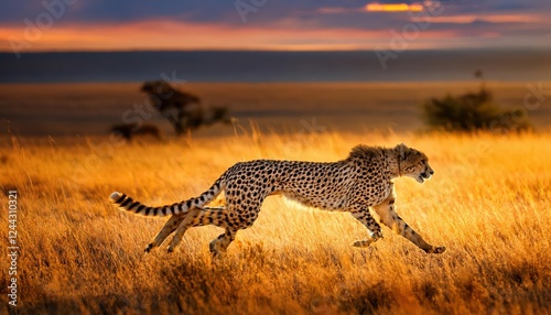Swift and Agile Cheetah outrunning the Setting Sun in a Golden Savannah, Embracing the African Plains Timeless Beauty and Dynamic Energy