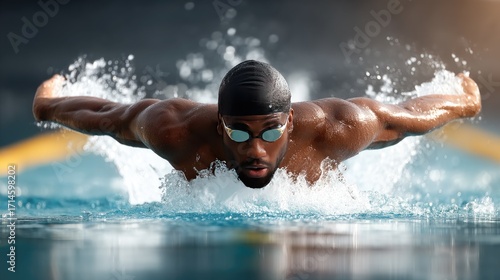 Swimmer performing a powerful butterfly stroke in a competitive pool setting during daytime