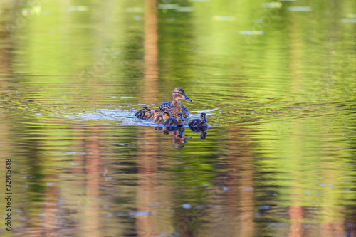Swimming female Mallard with ducklings in a lake