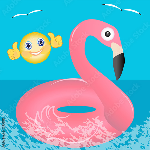 Swimming inflatable pink flamingo seascape, cheerful little man - vector. Summer vacation.