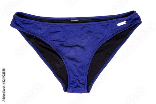 Swimsuits isolated. Close-up of a elegant female sexy blue bikini bottoms or panties isolated on a white background. Fashionable bikini swimwear.