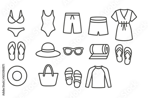 Swimwear Icons Collection. Line style icons of swimwear fashion: bikini set, one-piece swimsuit, swim trunks, beach cover-up, flip