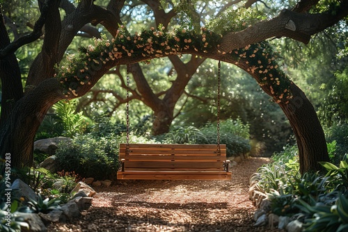 swing bench hanging from nature green gardening summer park outdoors beauty trees landscape day plants wooden flower wood celebration