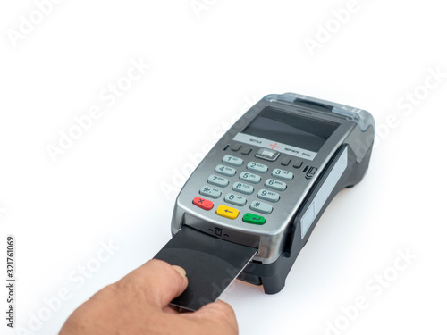 Swiping Credit card Payment terminal on white background, credit card reader, finance concept.