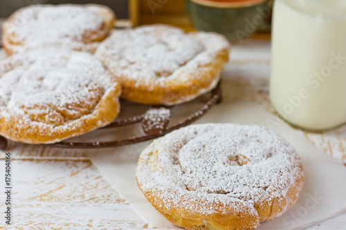Swirl Danish Pastry Ensaimada Powdered on Cooling Rack and Parchment Paper. Bottle of Milk White Plank Wood Tabletop. Rustic Kitchen Interior.