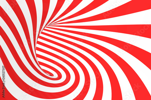 Swirl optical 3D illusion raster illustration. Contrast red and white spiral stripes. Geometric torus image with lines, loops.