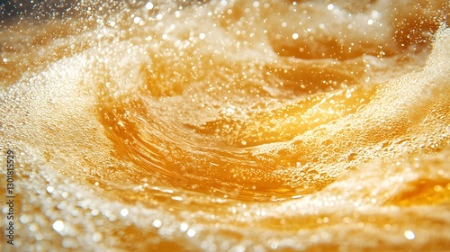 Swirling Foam on Surface of Golden Liquid with Bubbles and Sparkles