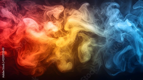 Swirling fog and smoke in vibrant red yellow orange and blue colors forming an abstract cinematic and dramatic background This surreal and ethereal image creates a sense of mystery and imagination