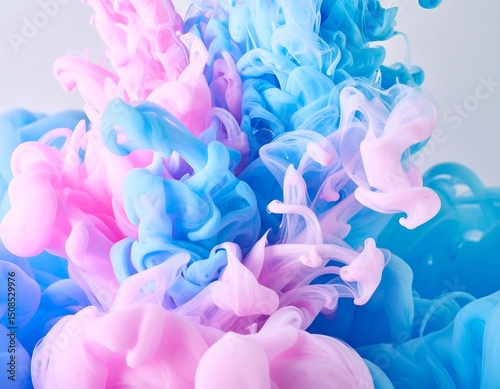 Swirling pastel pink and blue inks create an abstract, ethereal underwater scene