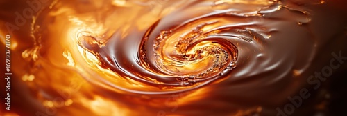 Swirling patterns of brown liquid create mesmerizing abstract art in vibrant warm tones, evoking energy and dynamism in a creative environment