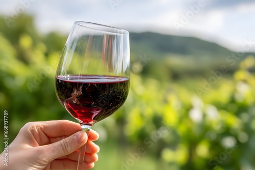Swirling red wine in a glass among vineyard backdrop Generative AI