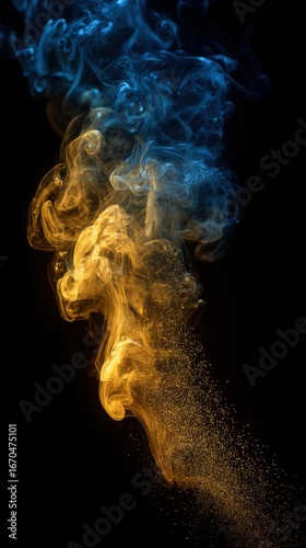 Swirling smoke vortex in amber and cobalt blue tones with fine golden particles against black background, abstract motion art concept with glowing ethereal effect