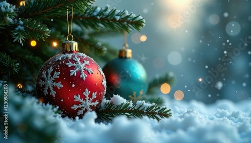 Swirling snowflakes encircle glittering ornaments amidst evergreen branches, evergreen, winter