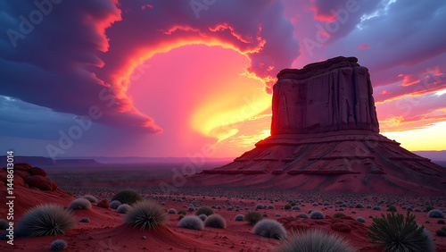 swirling vortex clouds envelops rugged rock formation warm golden light casts long shadows across desert landscape