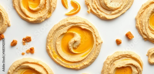 Swirls of creamy hummus, various textures, on pristine white background, flavorful, mediterranean