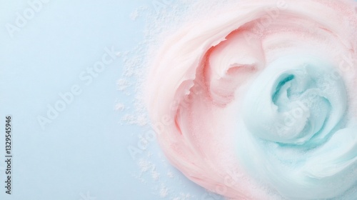 Swirls of pastel cotton candy afloat on a light blue background evoking a playful carnival atmosphere