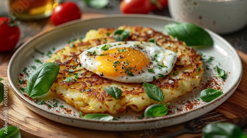 Swiss rsti crispy potato cake topped fried egg plated on white ceramic dish