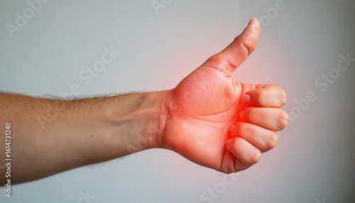 Swollen thumb joint displaying pain indoors, medical symbolism