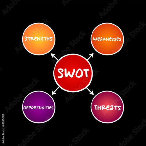 SWOT analysis acronym - strategic management technique used to help a person or organization identify strengths, weaknesses, opportunities, and threats, mind map business concept